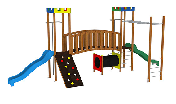 Conjunto para parques infantiles con múltiples torres , deslizaderas, pasamanos y columpios. Para que los niños corran, salten y gateen divirtiéndose con la máxima seguridad.